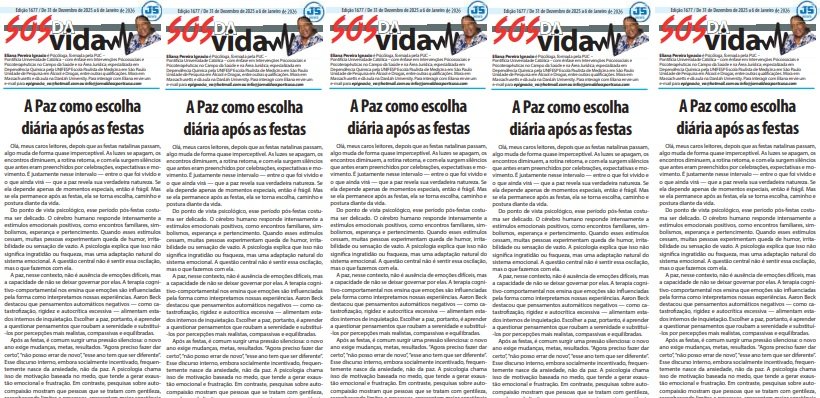 Aaron Beck destacou que pensamentos automáticos negativos — como catastrofização, rigidez e autocrítica excessiva — alimentam estados internos de inquietação. Escolher a paz, portanto, é aprender a questionar pensamentos que roubam a serenidade e substituí-los por percepções mais realistas, compassivas e equilibradas. Após as festas, é comum surgir uma pressão silenciosa: o novo ano exige mudanças, metas, resultados. “Agora preciso fazer dar certo”, “não posso errar de novo”, “esse ano tem que ser diferente”. Esse discurso interno, embora socialmente incentivado, frequentemente nasce da ansiedade, não da paz.