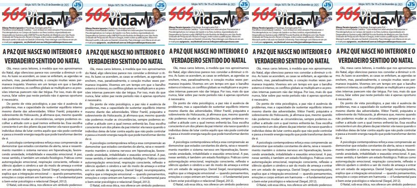 Em tempos de Natal, somos chamados a olhar menos para fora e mais para dentro: quais conflitos internos ainda alimentamos? Quais mágoas mantemos vivas? Quais expectativas irreais continuam roubando nossa serenidade? O Evangelho nos lembra que a verdadeira paz não é a mesma que o mundo oferece. Não é baseada em circunstâncias favoráveis, conquistas ou controle absoluto. É uma paz que sustenta, mesmo quando tudo ao redor parece instável. Psicologicamente, isso se traduz na capacidade de tolerar frustrações, aceitar limites e cultivar esperança realista. Espiritualmente, é confiar que não caminhamos sozinhos.