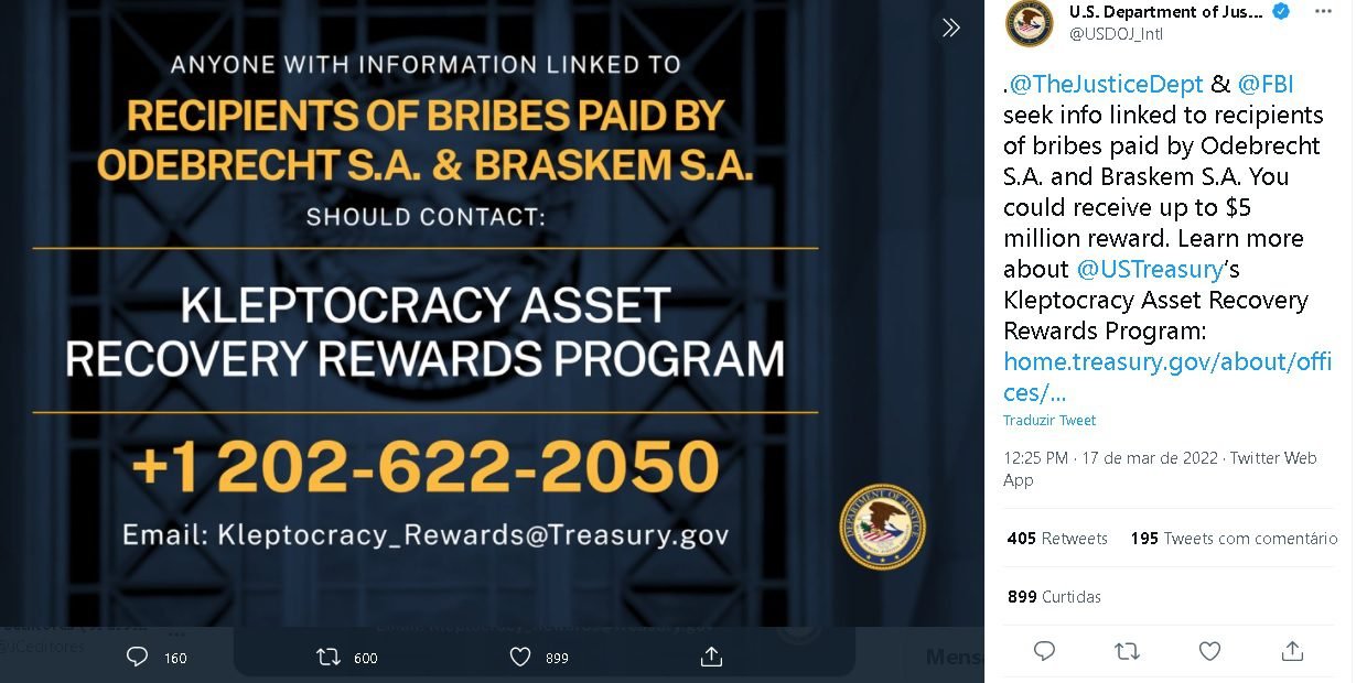 EUA oferecem US$ 5 mi por dados de propinas de Braskem e Odebrecht