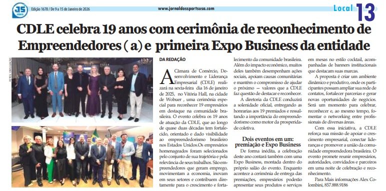 A Câmara de Comércio, Desenvolvimento e Liderança Empresarial (CDLE) realizará na sexta-feira dia 16 de janeiro de 2025, no Vitória Hall, na cidade de Wobuer , uma cerimônia especial para reconhecer 19 empresários em destaque na comunidade brasileira. O evento celebra os 19 anos de atuação da CDLE, que ao longo de quase duas décadas tem fortalecido, orientado e dado visibilidade ao empreendedorismo brasileiro nos Estados Unidos.
