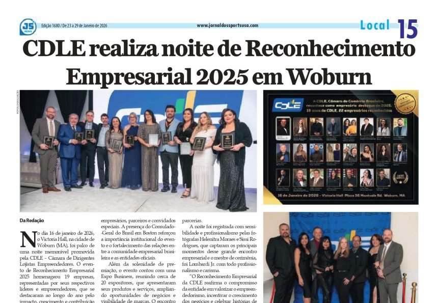 No dia 16 de janeiro de 2026, o Victoria Hall, na cidade de Woburn (MA), foi palco de uma noite memorável promovida pela CDLE – Câmara de Dirigentes Lojistas Empreendedores. O evento de Reconhecimento Empresarial 2025 homenageou 19 empresas, representadas por seus respectivos líderes e empreendedores, que se destacaram ao longo do ano pelo impacto, crescimento e contribuição à comunidade empresarial.