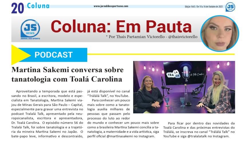 Aproveitando a temporada que está passando no Brasil, a escritora, modelo e especialista em Tanatologia, Martina Sakemi viajou de Minas Gerais para São Paulo – Capital, especialmente para gravar uma entrevista no podcast Tralalá Talk, apresentado pela neuropsicanalista, escritora e apresentadora, Dr. Toalá Carolina. O episódio número 56 do Tralalá Talk, foi sobre tanatologia e a trajetória da mineira Martina Sakemi no Japão.