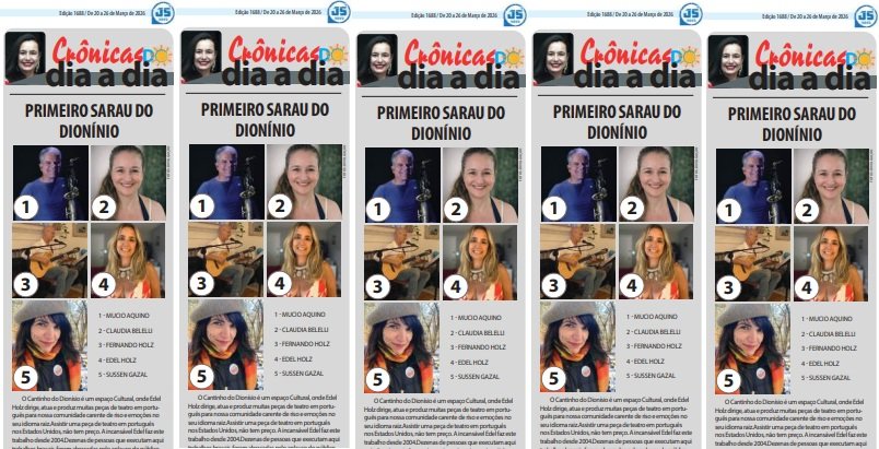 O Sarau do Dionísio será nesta sexta- feira, dia 20 de março, às 8 pm no Cantinho do Dionínio: 8 Summer st Woburn-MA. Ingressos:$20 zelle: Maria Holz 617-239-8403 ou vemno: @Maria-Holz