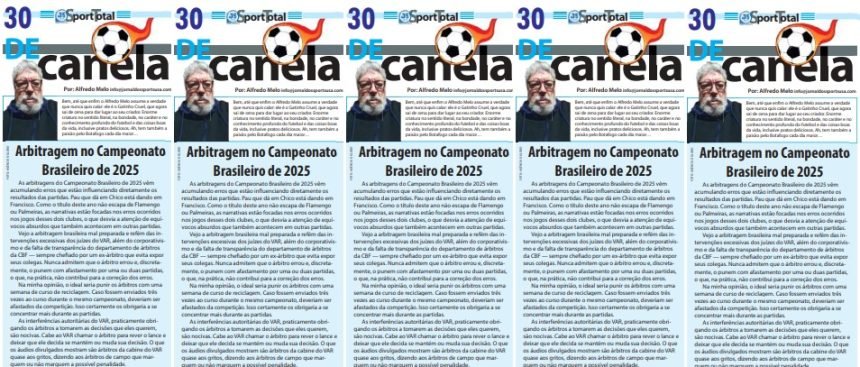 Vejo a arbitragem brasileira mal preparada e refém das intervenções excessivas dos juízes do VAR, além do corporativismo e da falta de transparência do departamento de árbitros da CBF — sempre chefiado por um ex-árbitro que evita expor seus colegas. Nunca admitem que o árbitro errou e, discretamente, o punem com afastamento por uma ou duas partidas, o que, na prática, não contribui para a correção dos erros. Na minha opinião, o ideal seria punir os árbitros com uma semana de curso de reciclagem. Caso fossem enviados três vezes ao curso durante o mesmo campeonato, deveriam ser afastados da competição. Isso certamente os obrigaria a se concentrar mais durante as partidas.