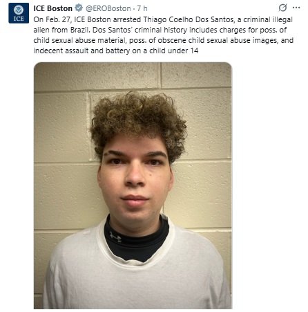 On Feb. 27, ICE Boston arrested Thiago Coelho Dos Santos, a criminal illegal alien from Brazil. Dos Santos’ criminal history includes charges for poss. of child sexual abuse material, poss. of obscene child sexual abuse images, and indecent assault and battery on a child under 14 pic.twitter.com/CMMi17JJxU