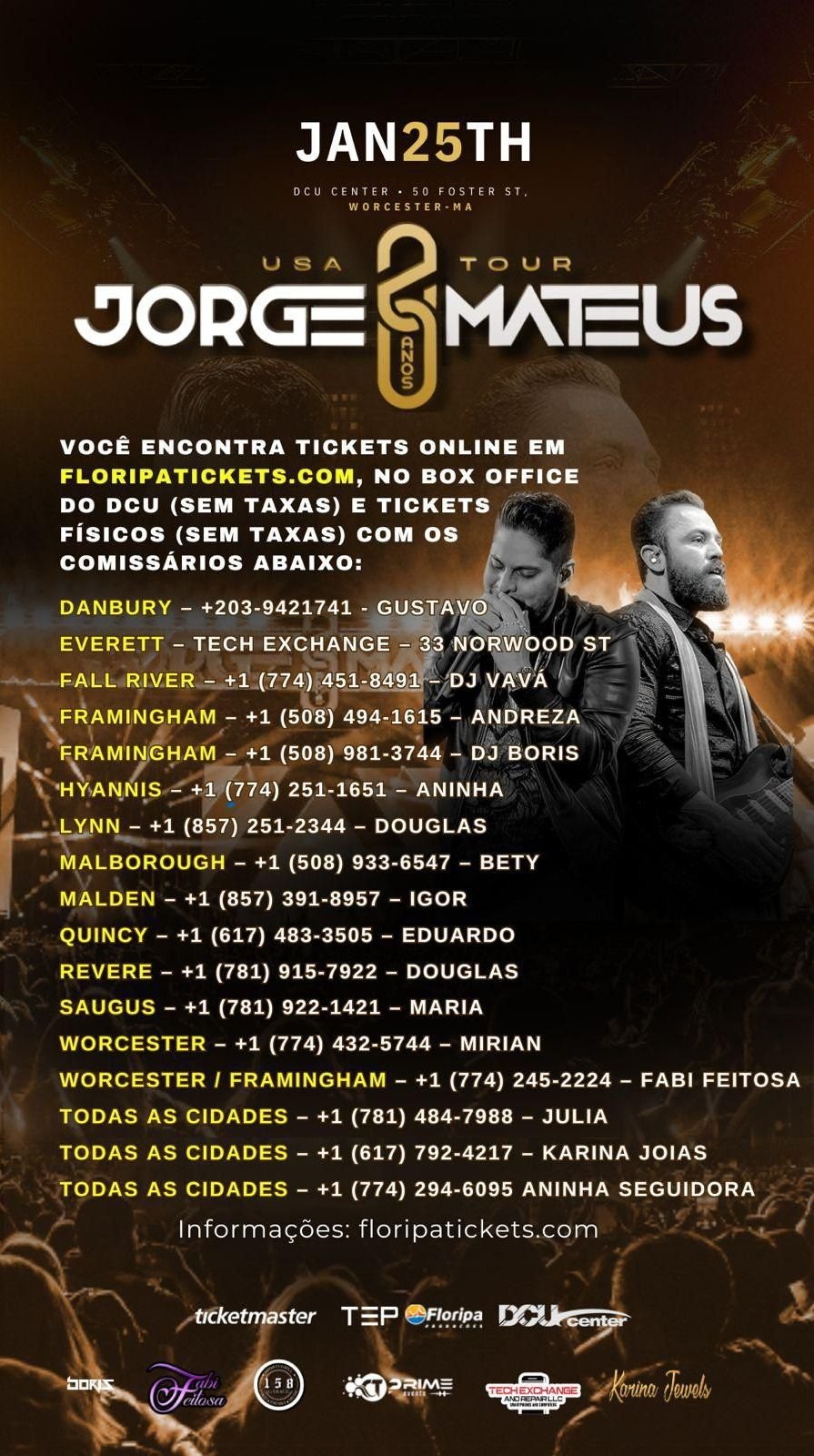 A maior dupla sertaneja do Brasil, Jorge & Mateus, chega aos Estados Unidos para um show especial em comemoração aos 20 anos de história da parceria que revolucionou o sertanejo universitário. No dia 25 de janeiro de 2026 (domingo), a dupla se apresenta no DCU Center, em Worcester, Massachusetts, às 19:30** (portas abrem às 17:30), com o evento “Jorge & Mateus – 20 Years of History | USA Tour”.