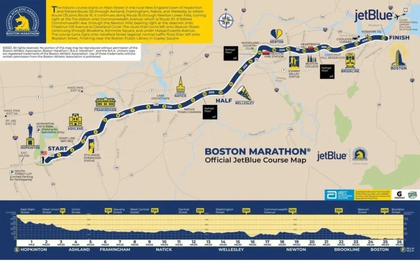 São 42,195 km de pura história: começa em Hopkinton e passa por oito cidades de Massachusetts até o centro de Boston. O trecho mais temido é o “Heartbreak Hill”, uma subida de cerca de 800 metros no quilômetro 32 que já decidiu várias edições.