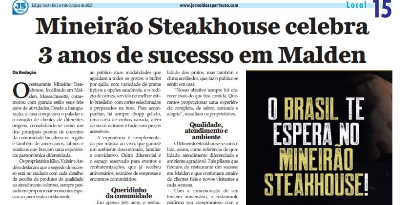 O restaurante Mineirão Steakhouse, localizado em Malden, Massachusetts, comemorou com grande estilo seus três anos de atividades. Desde a inauguração, a casa conquistou o paladar e o coração de clientes de diferentes origens, consolidando-se como um dos principais pontos de encontro da comunidade brasileira na região e de americanos, latinos e asiáticos que buscam uma experiência gastronômica diferenciada.