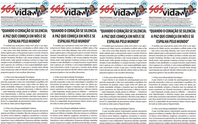 À medida que avançamos nesta minissérie e nos aproximamos do Natal, somos convidados a refletir sobre a Paz — não como uma ideia distante, mas como uma necessidade urgente para a vida pessoal e para o mundo. Vivemos tempos marcados por conflitos, tensões e medos que atravessam fronteiras, famílias e até nossas próprias emoções. Ainda assim, toda grande mudança começa no lugar mais simples e mais desafiador: o coração humano.