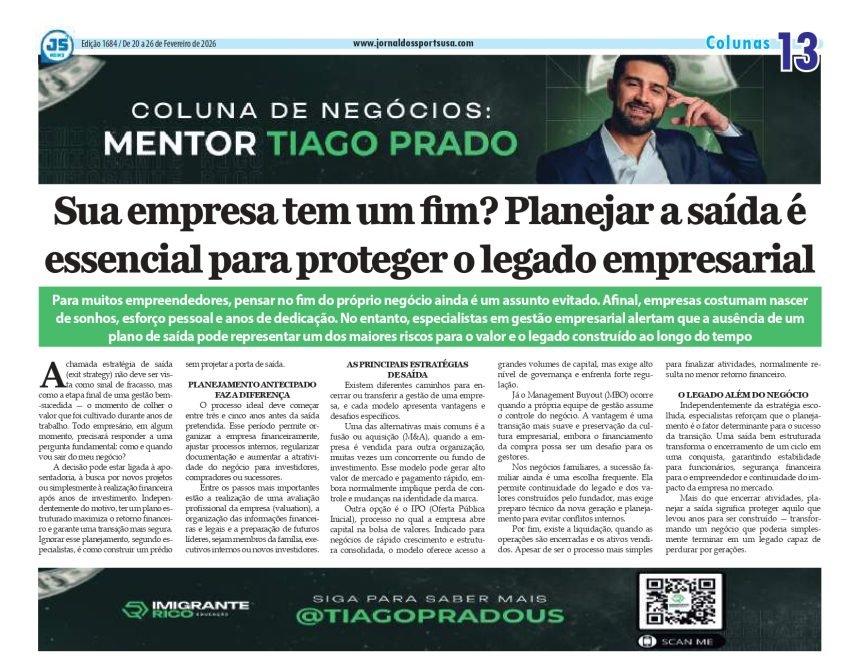 Mais do que encerrar atividades, planejar a saída significa proteger aquilo que levou anos para ser construído — transformando um negócio que poderia simplesmente terminar em um legado capaz de perdurar por gerações.